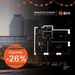 Продаётся 2-к квартира номер 227 общей площадью 57.6 кв.м. на 2-м этаже 23 этажного здания. Отделка Whitebox. Цена с учётом скидки.