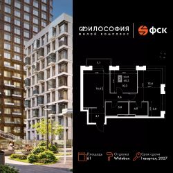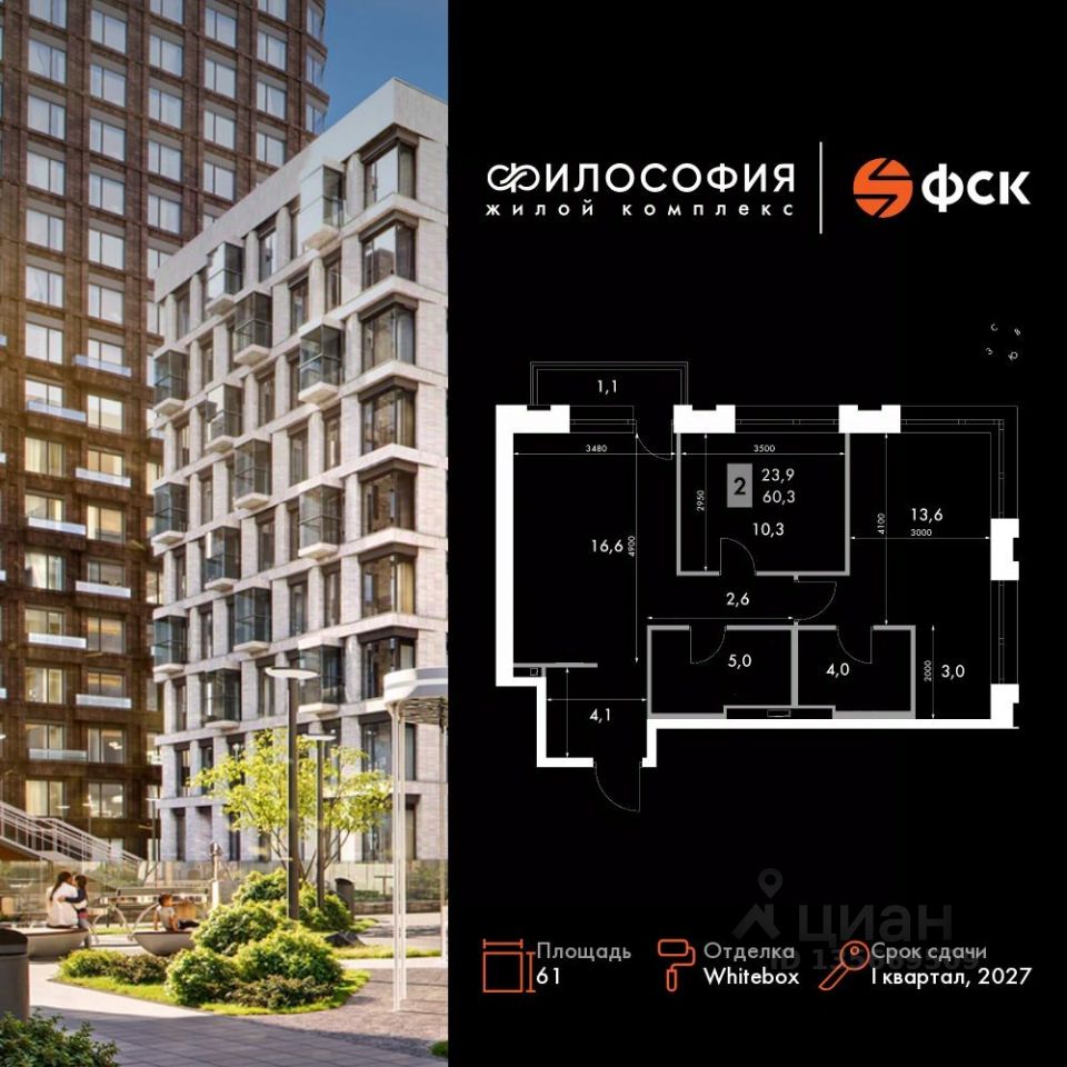 Продаётся 2-к квартира номер 251 общей площадью 61 кв.м. на 5-м этаже 23 этажного здания. Отделка Whitebox. Цена с учётом скидки.