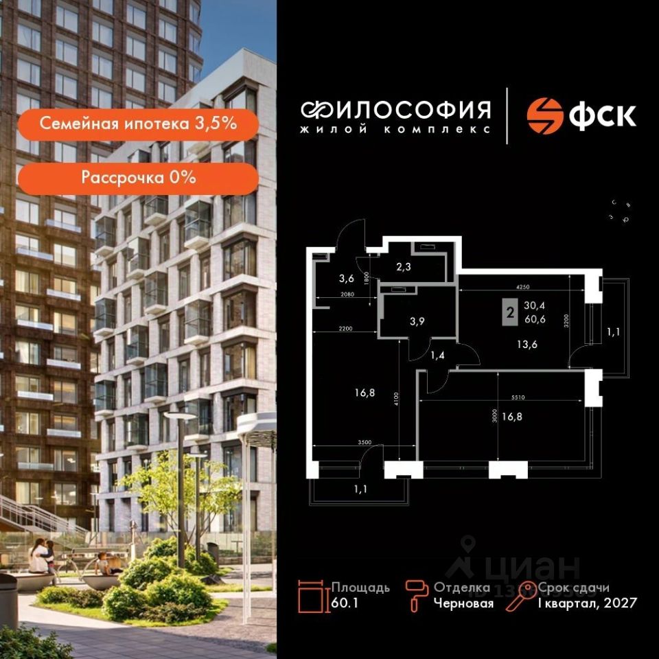 Продаётся 2-к квартира номер 299 общей площадью 60.1 кв.м. на 10-м этаже 23 этажного дома. Отделка Whitebox. Цена с учётом скидки!