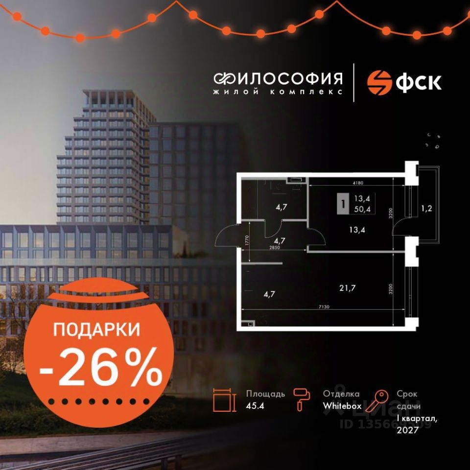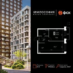 Продаётся 2-к квартира номер 315 общей площадью 45.4 кв.м. на 12-м этаже 23 этажного здания. Отделка Whitebox. Цена с учётом скидки.