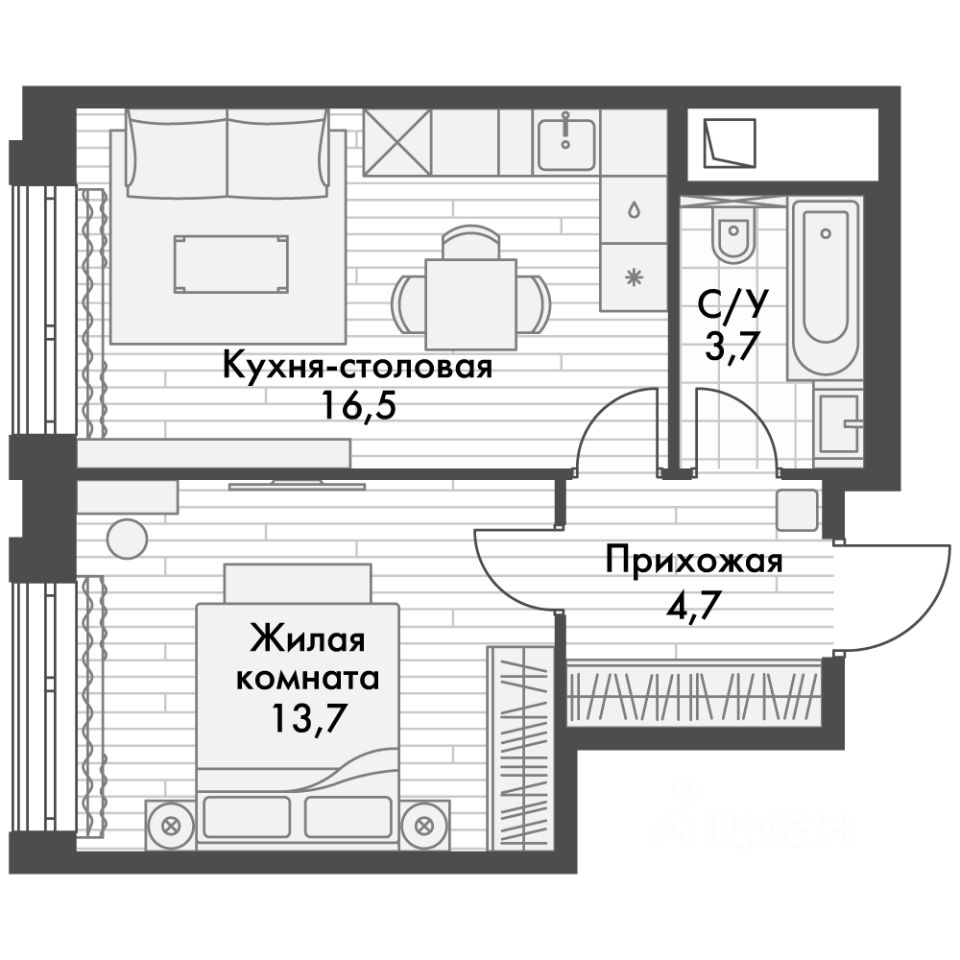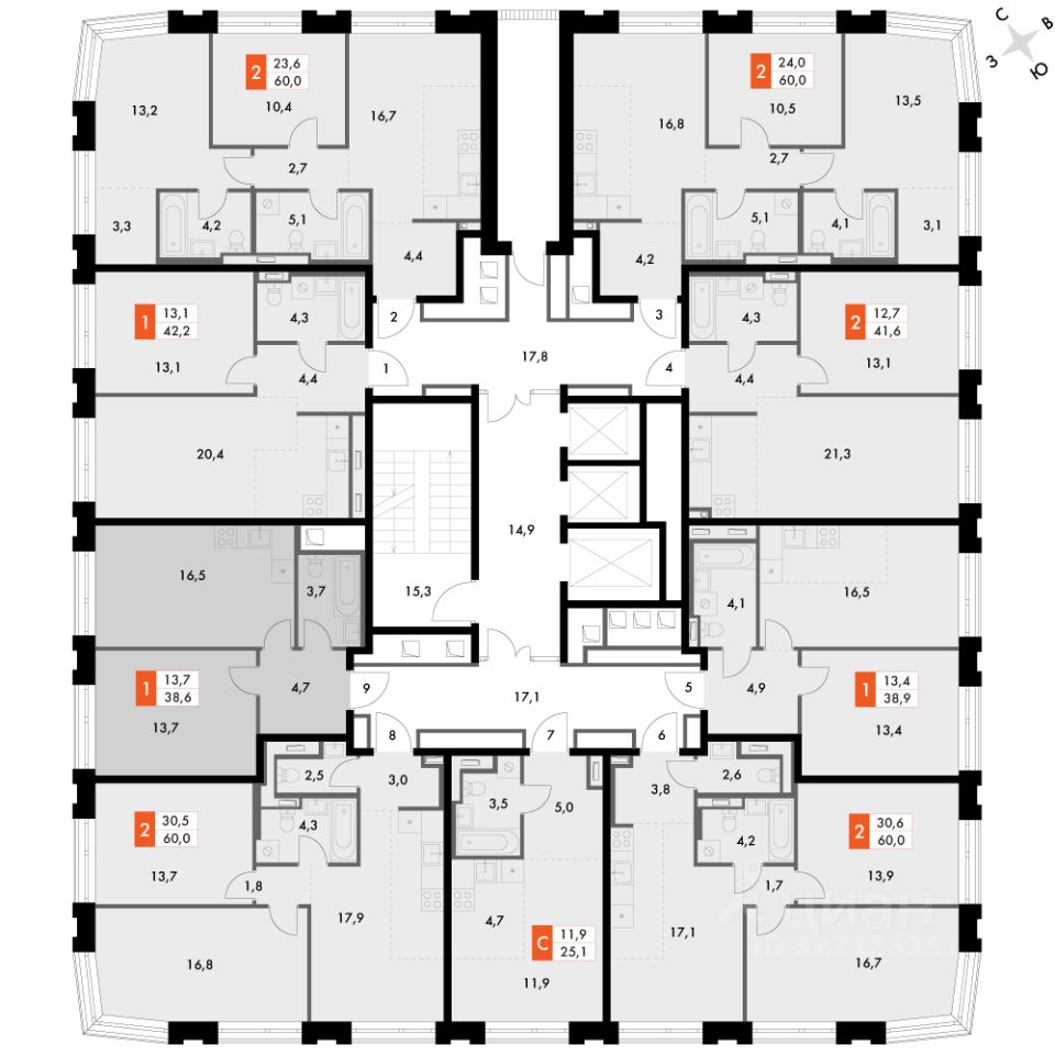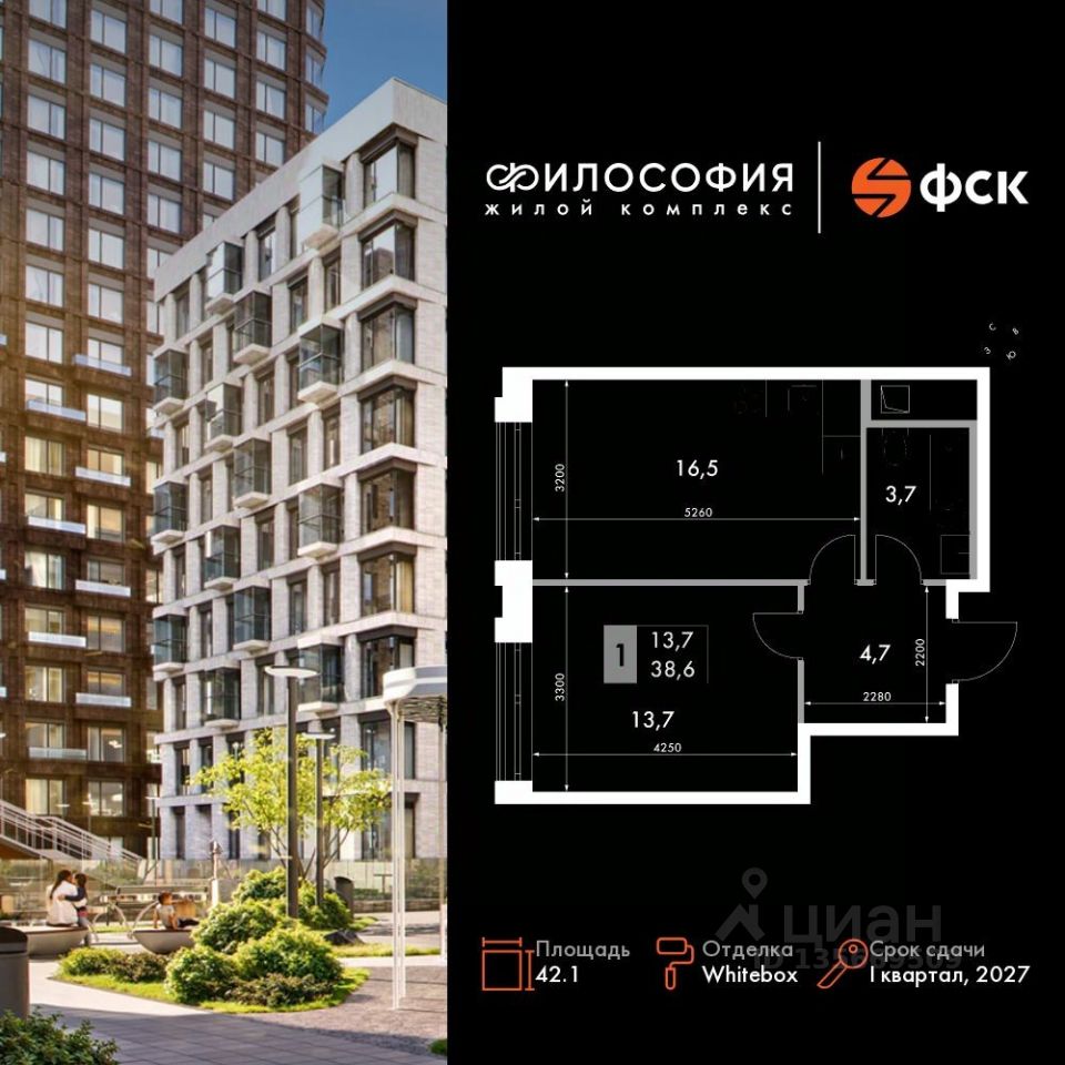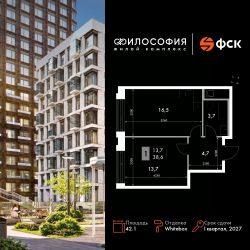 Продаётся 1-к квартира номер 347 общей площадью 42.1 кв.м. на 15-м этаже 23 этажного здания. Отделка Whitebox. Цена с учётом скидки.
