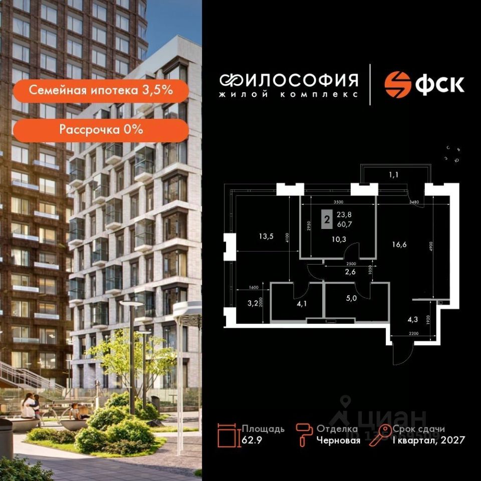 Продаётся 2-к квартира номер 241 общей площадью 62.9 кв.м. на 4-м этаже 23 этажного дома. Отделка Whitebox. Цена с учётом скидки!