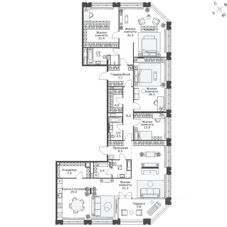 - Мастер-зона с санузлом и гардеробной. Всё для вашего комфорта и удобства, включая личный санузел и гардероб.