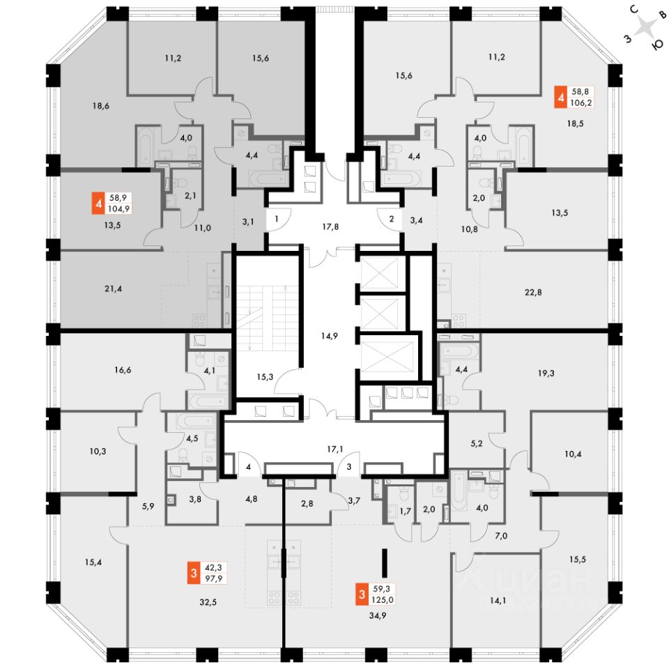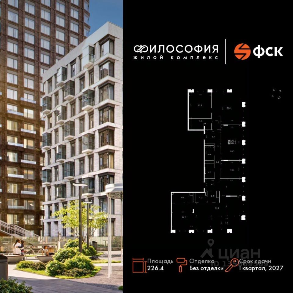 Продаётся 5-к квартира номер 399 общей площадью 226.4 кв.м. на 23-м этаже 23 этажного здания. Без отделки. Цена с учётом скидки.