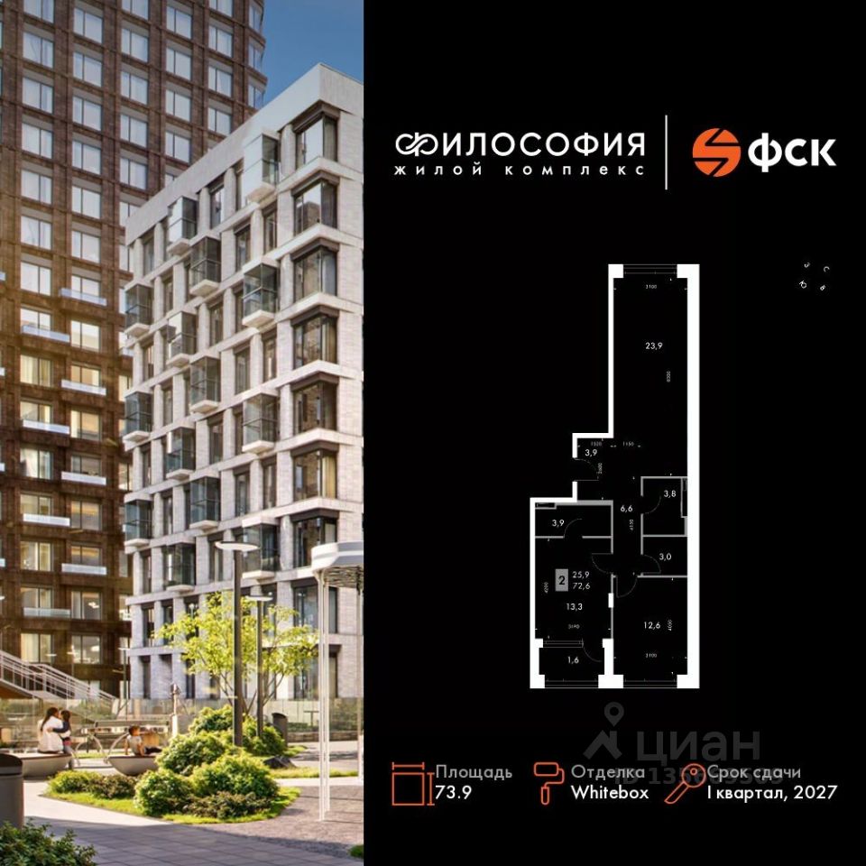 Продаётся 2-к квартира номер 25 общей площадью 73.9 кв.м. на 5-м этаже 14 этажного здания. Отделка Whitebox. Цена с учётом скидки.