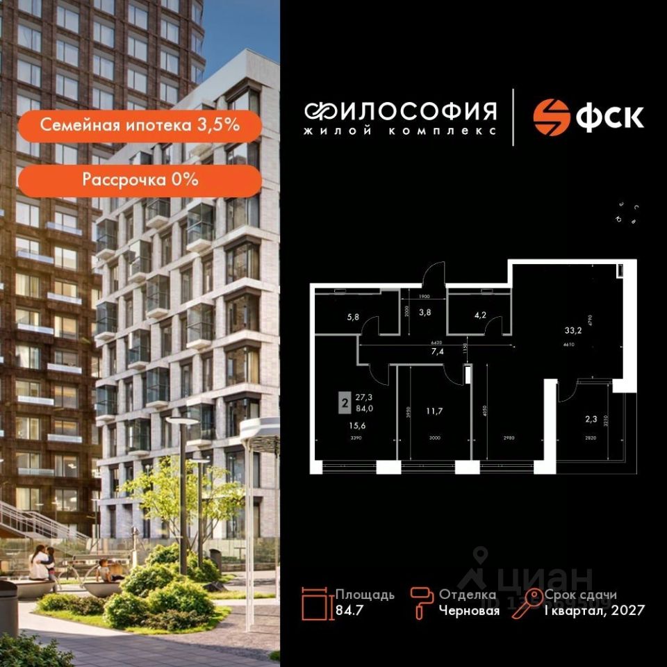 Продаётся 3-к квартира номер 110 общей площадью 84.7 кв.м. на 13-м этаже 14 этажного дома. Отделка Whitebox. Цена с учётом скидки!