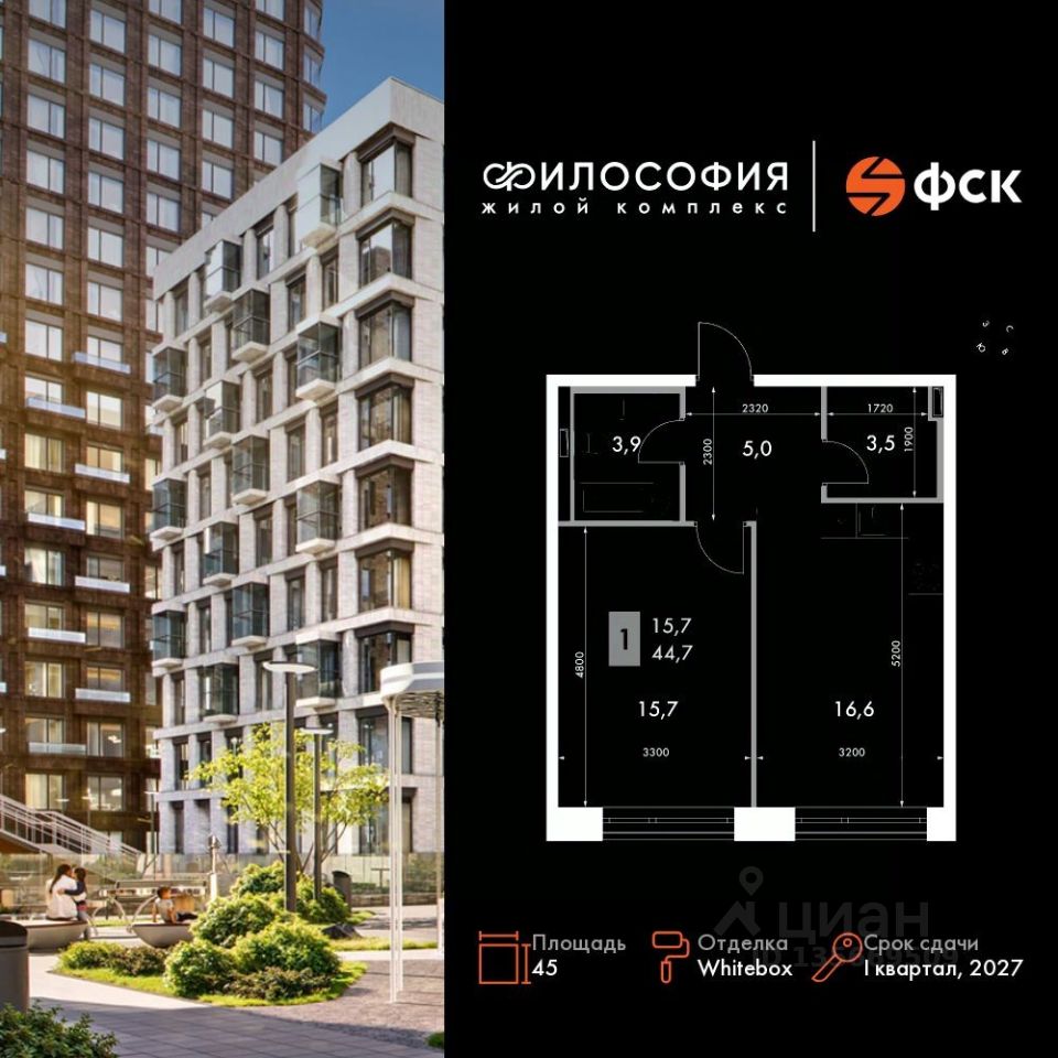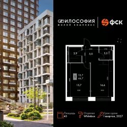 Продаётся 1-к квартира номер 119 общей площадью 45 кв.м. на 14-м этаже 14 этажного здания. Отделка Whitebox. Цена с учётом скидки.