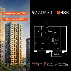 Продаётся 2-к квартира номер 564 общей площадью 46.3 кв.м. на 5-м этаже 12 этажного дома. Отделка Whitebox. Цена с учётом скидки!