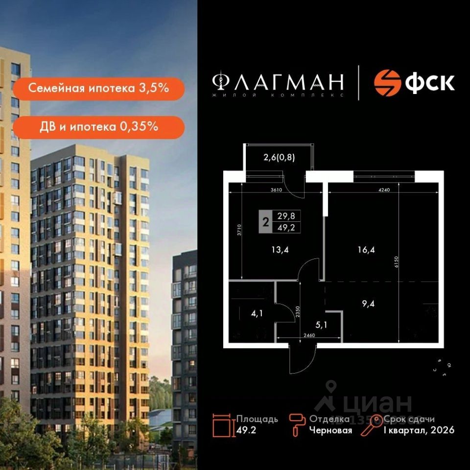 Продаётся 2-к квартира номер 631 общей площадью 49.2 кв.м. на 12-м этаже 12 этажного дома. Отделка Whitebox. Цена с учётом скидки!