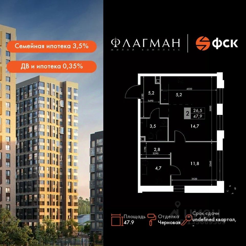 Продаётся 2-к квартира номер 535 общей площадью 47.9 кв.м. на 2-м этаже 12 этажного дома. Отделка Whitebox. Цена с учётом скидки!