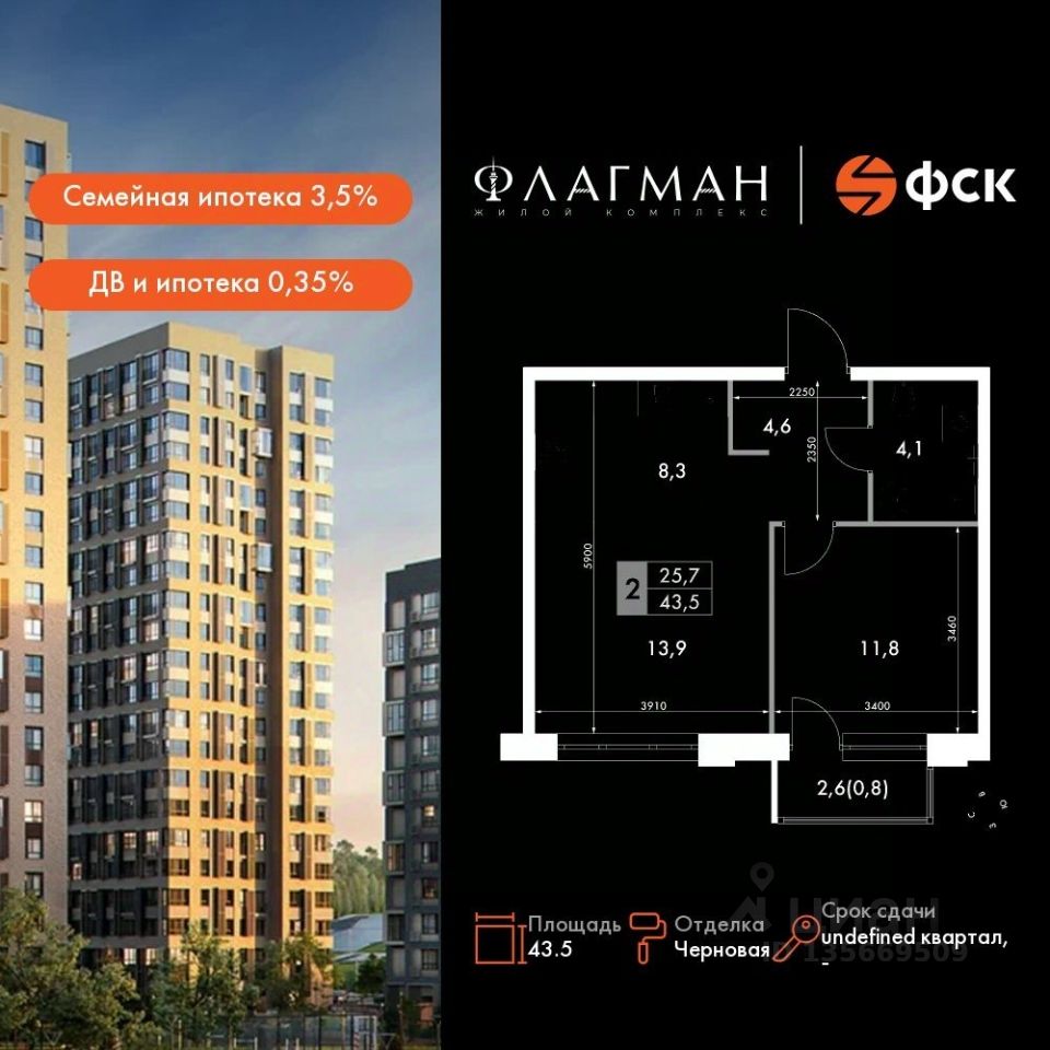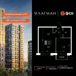 Продаётся 2-к квартира номер 583 общей площадью 43.5 кв.м. на 7-м этаже 12 этажного дома. Отделка Whitebox. Цена с учётом скидки!