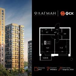 Продаётся 1-к квартира номер 608 общей площадью 39.6 кв.м. на 10-м этаже 12 этажного дома. Отделка Whitebox. Цена с учётом скидки!