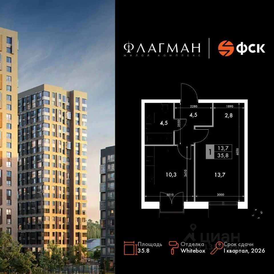 Продаётся 1-к квартира номер 387 общей площадью 35.8 кв.м. на 10-м этаже 22 этажного дома. Отделка Whitebox. Цена с учётом скидки!