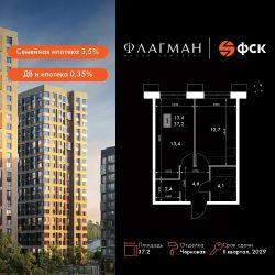 Продаётся 1-к квартира номер 86 общей площадью 37.2 кв.м. на 9-м этаже 30 этажного дома. Отделка Whitebox. Цена с учётом скидки!