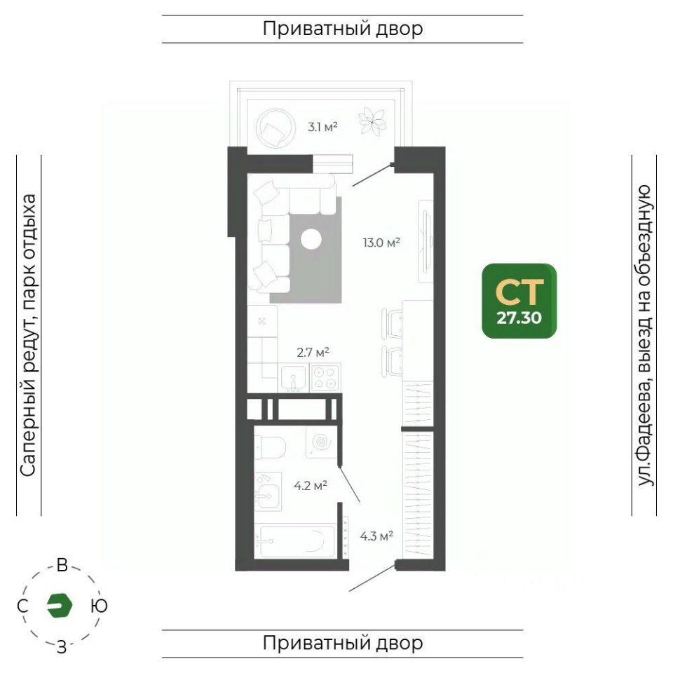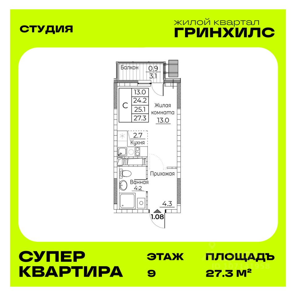Общая площадь квартиры — 27.3 кв. м, этаж 9 из 20.