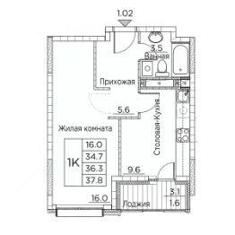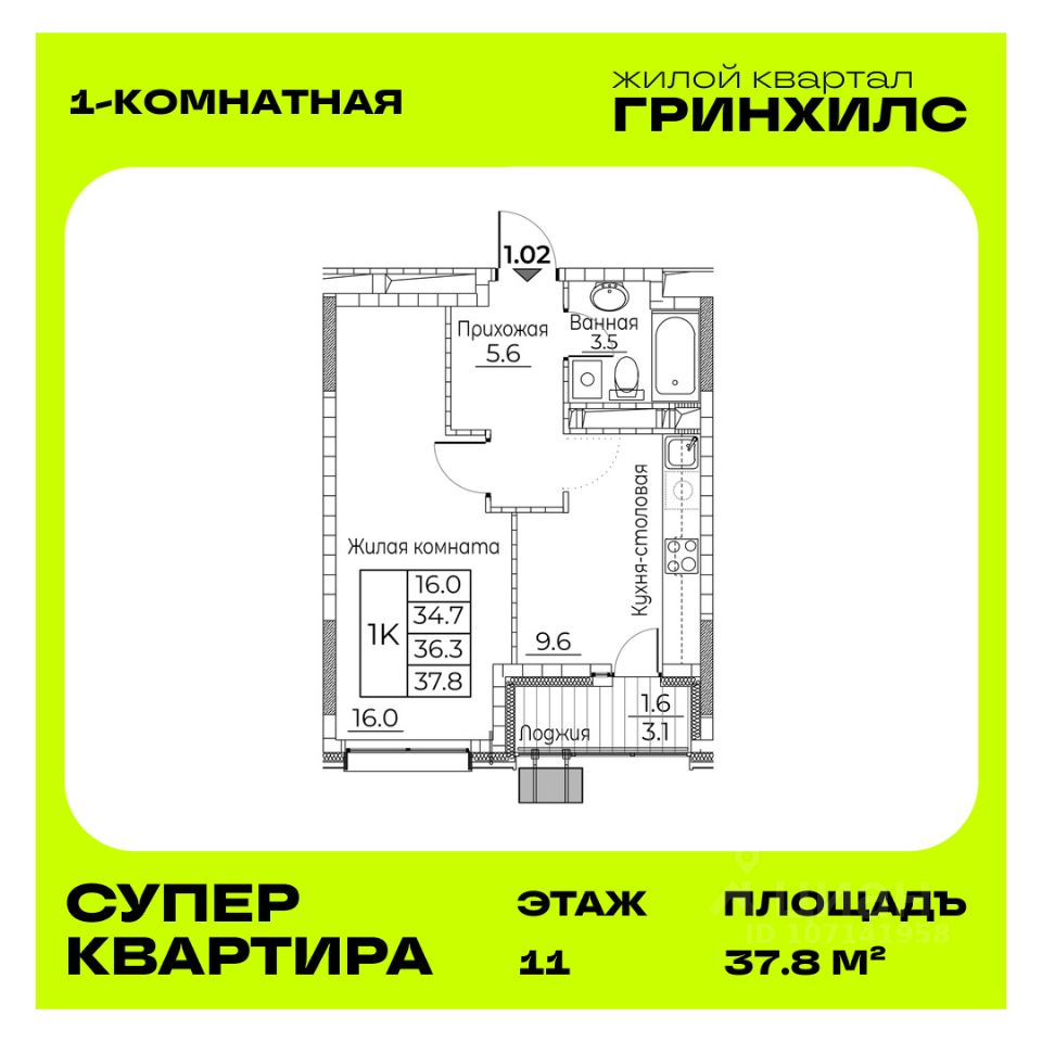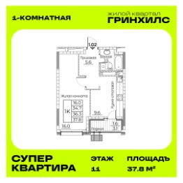 Общая площадь квартиры — 37.8 кв. м, этаж 11 из 20.
