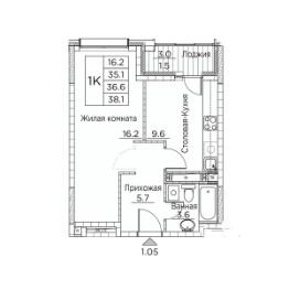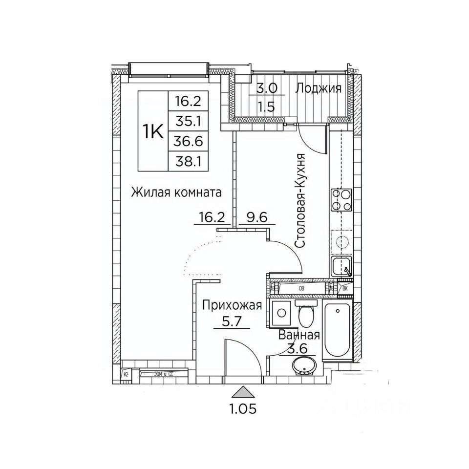 Общая площадь38,1 м²