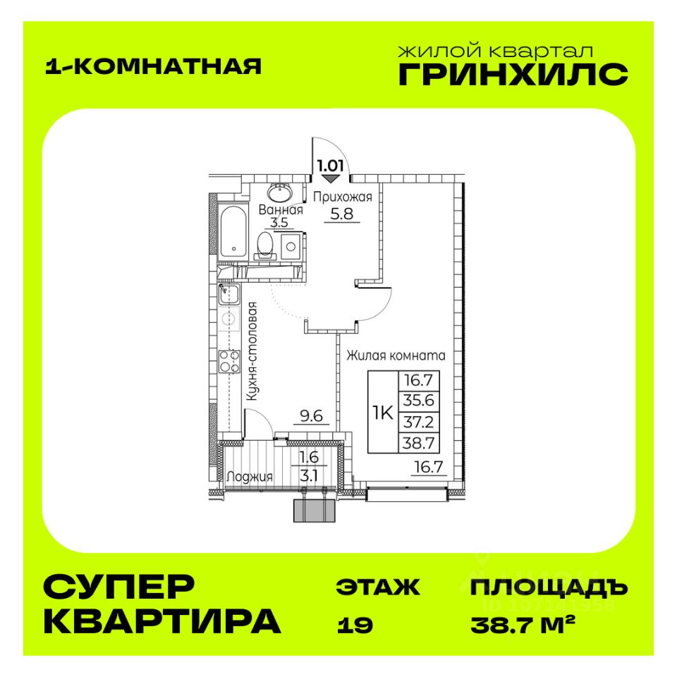 Общая площадь квартиры — 38.7 кв. м, этаж 19 из 20.
