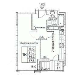 Общая площадь квартиры — 37.8 кв. м, этаж 19 из 20.