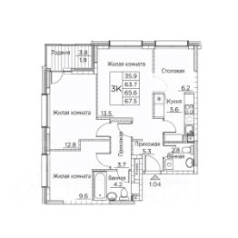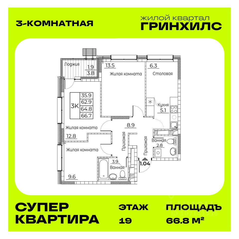 Общая площадь квартиры — 66.8 кв. м, этаж 19 из 20.