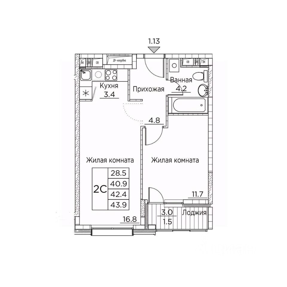 Общая площадь квартиры — 43.9 кв. м, этаж 19 из 20.