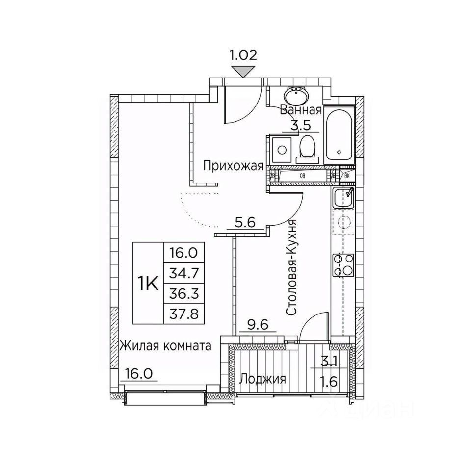 Общая площадь37,8 м²