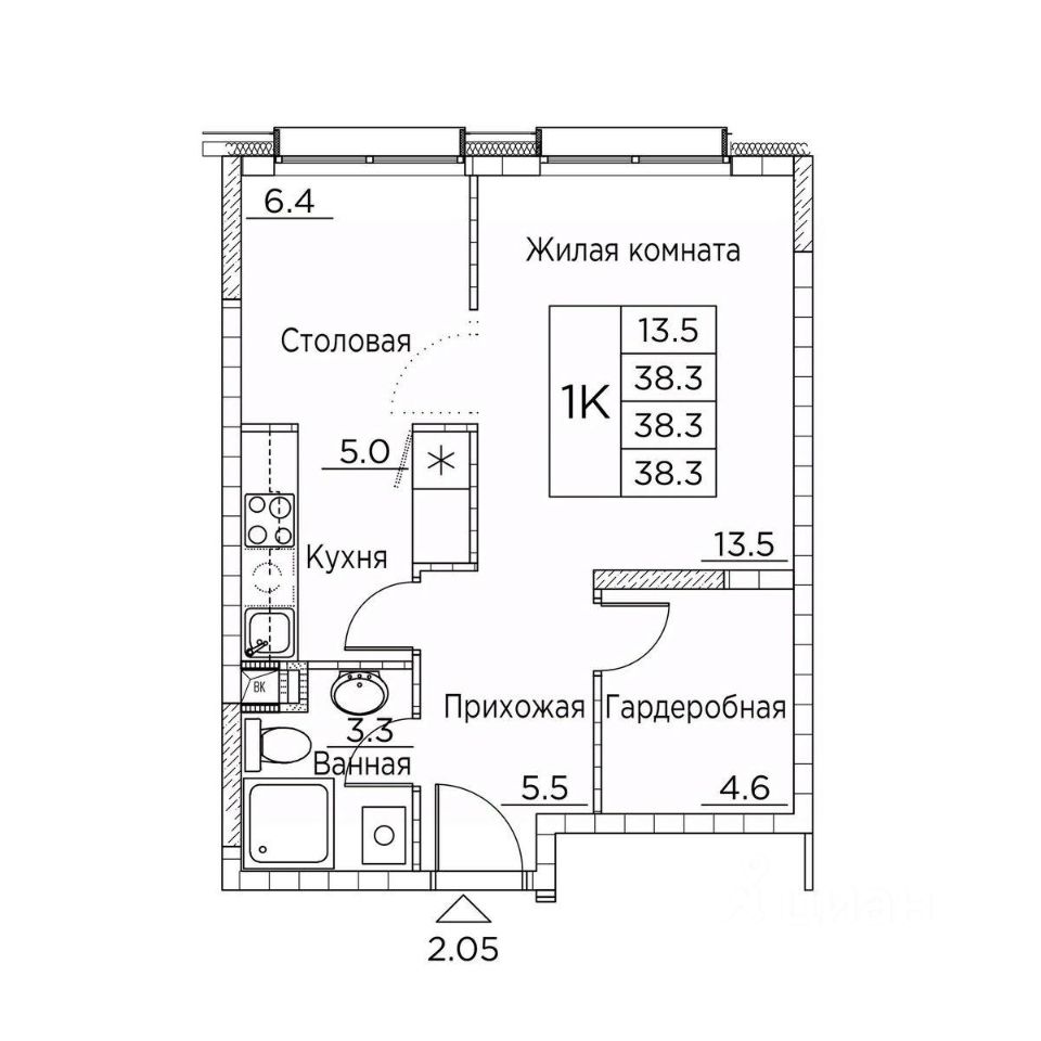 Общая площадь38,3 м²