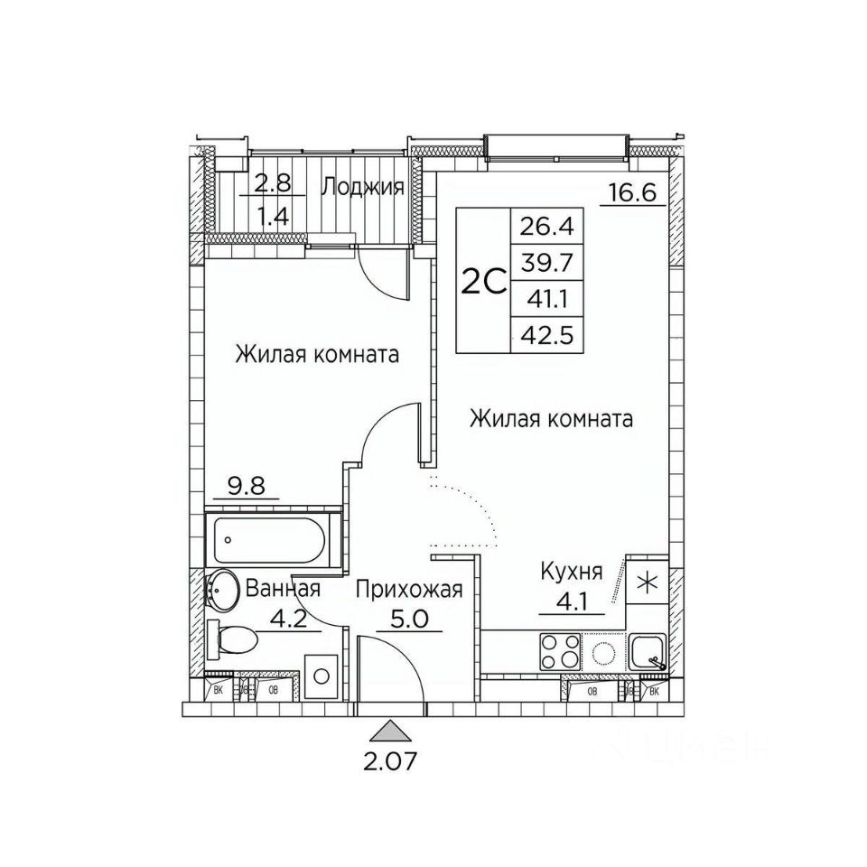 Общая площадь42,5 м²