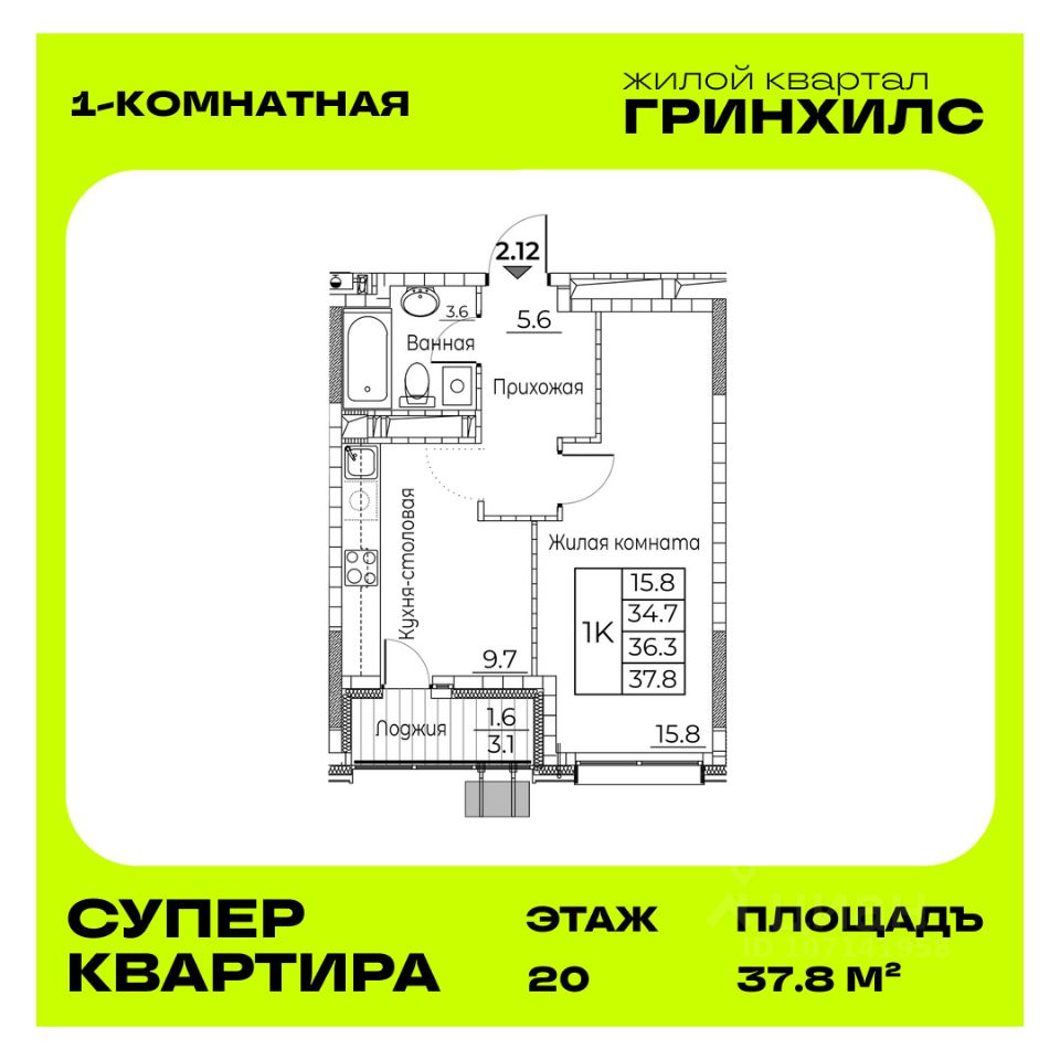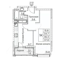 Общая площадь квартиры — 37.8 кв. м, этаж 20 из 21.