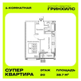 Общая площадь квартиры — 38.7 кв. м, этаж 20 из 21.