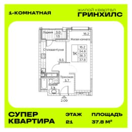 Общая площадь квартиры — 37.8 кв. м, этаж 21 из 21.