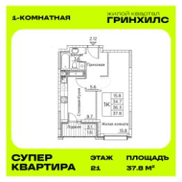 Общая площадь квартиры — 37.8 кв. м, этаж 21 из 21.