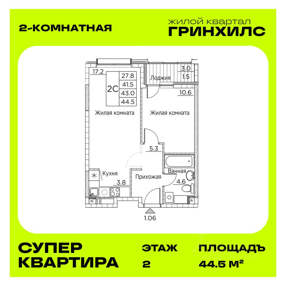 Общая площадь квартиры — 44.5 кв. м, этаж 2 из 22.