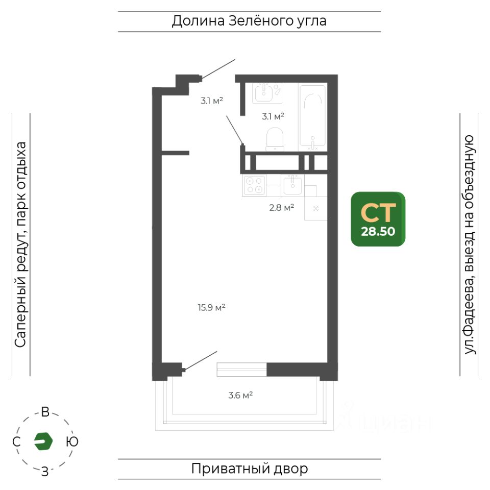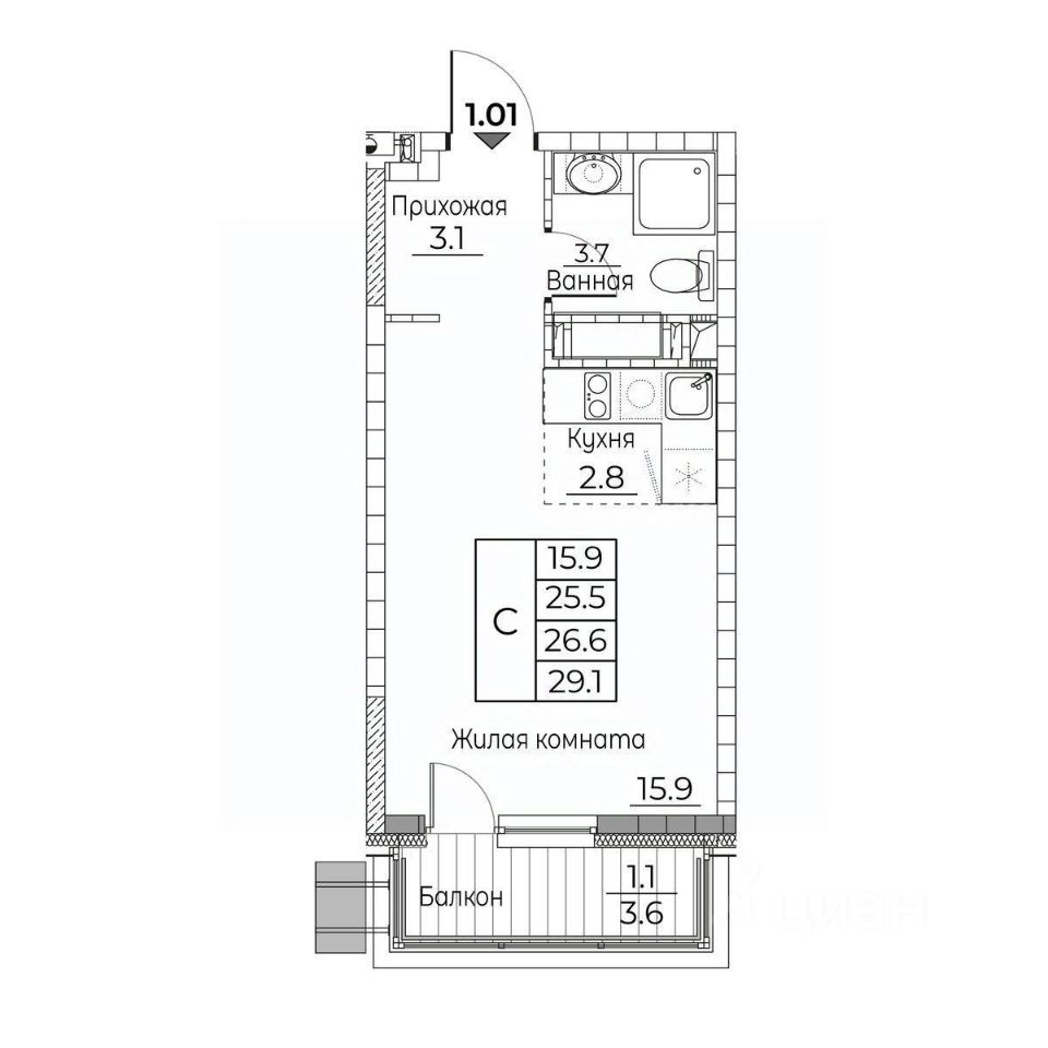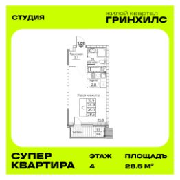 Общая площадь квартиры — 28.5 кв. м, этаж 4 из 22.