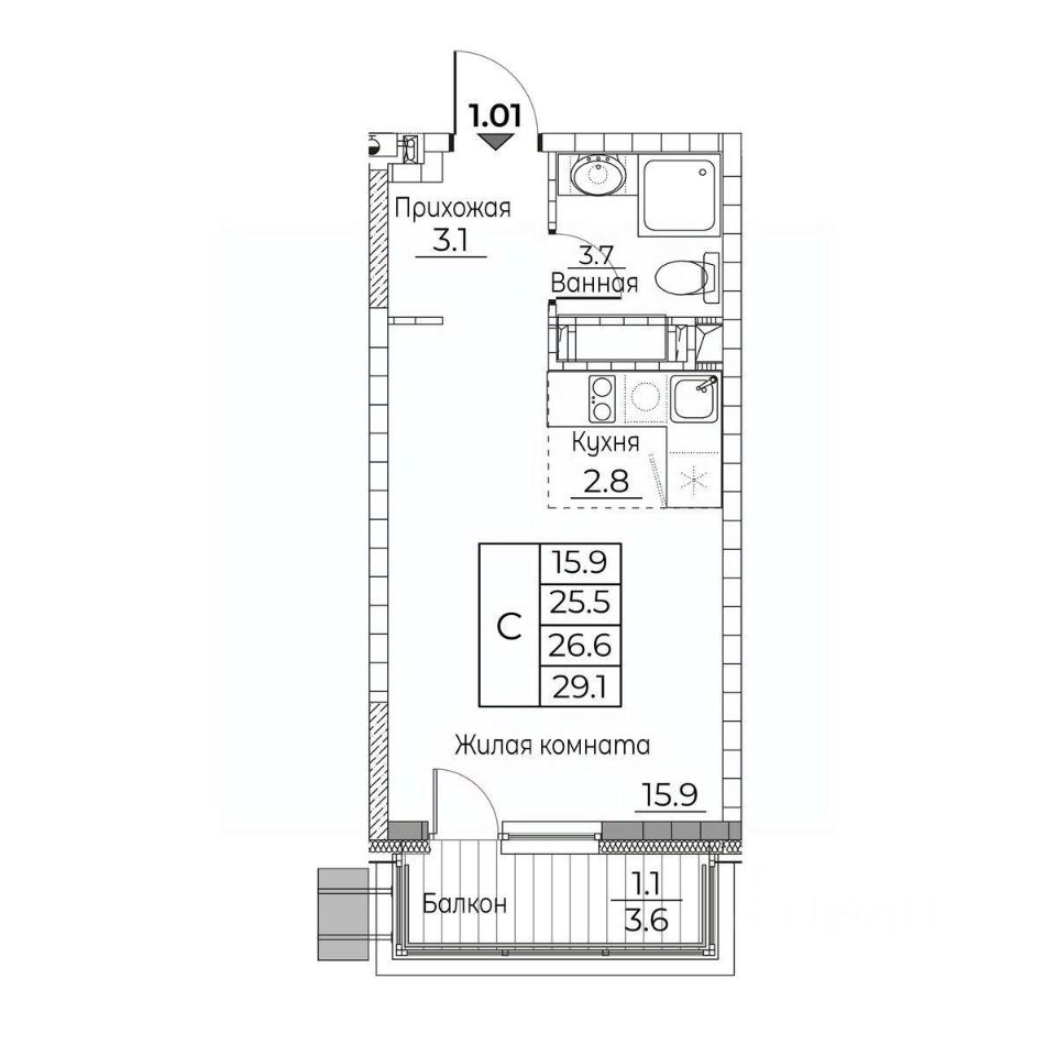 Общая площадь квартиры — 28.5 кв. м, этаж 8 из 22.