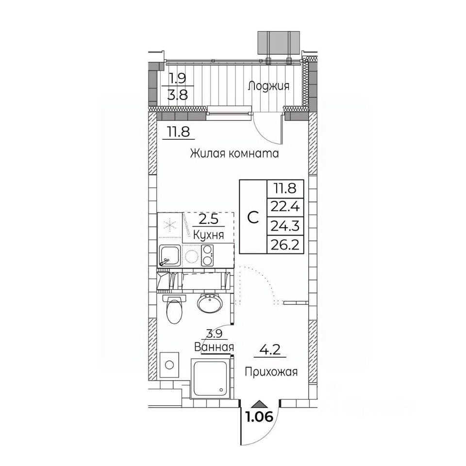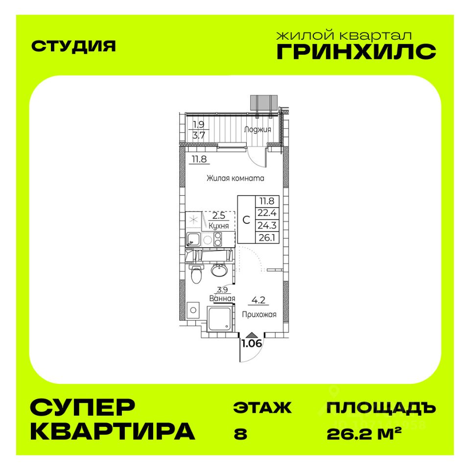 Общая площадь квартиры — 26.2 кв. м, этаж 8 из 22.
