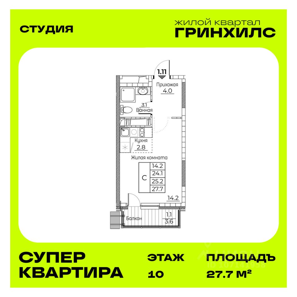 Общая площадь квартиры — 27.7 кв. м, этаж 10 из 22.