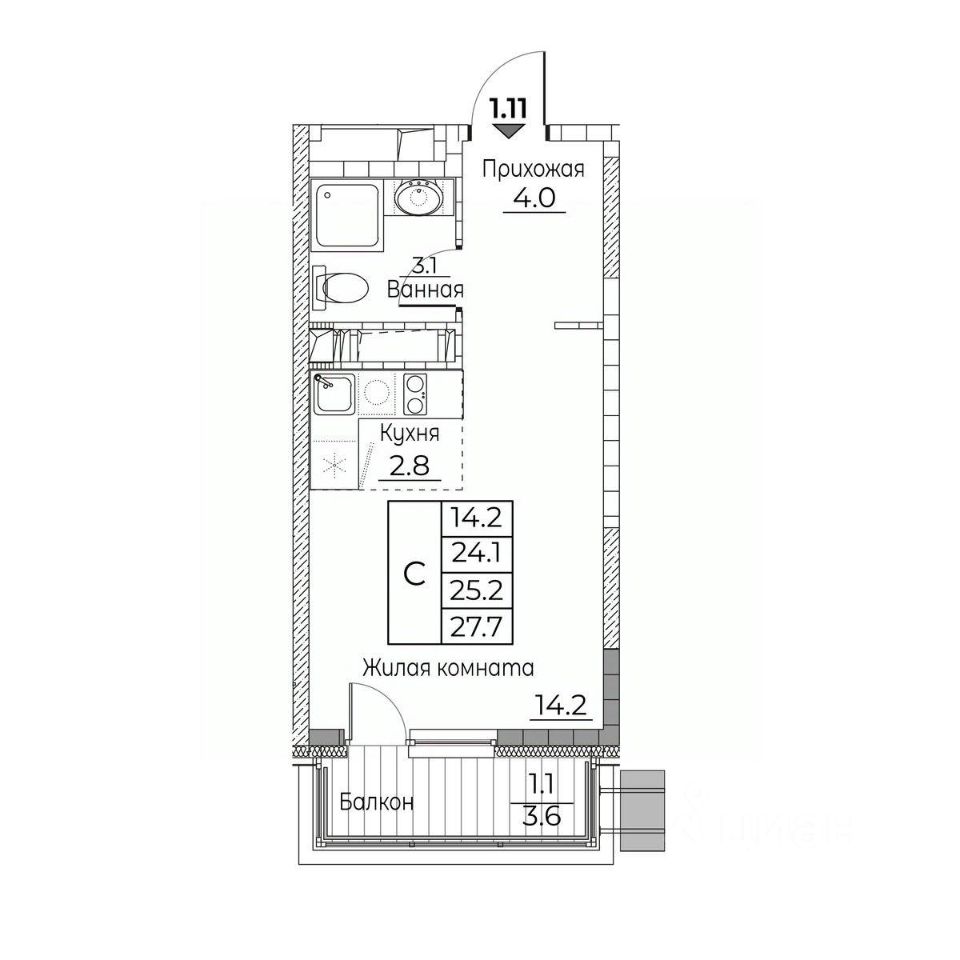 Общая площадь квартиры — 27.7 кв. м, этаж 11 из 22.
