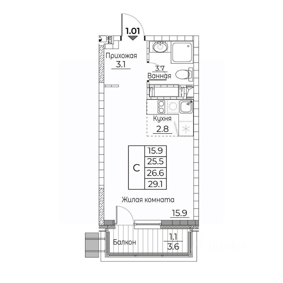 Общая площадь квартиры — 28.5 кв. м, этаж 12 из 22.