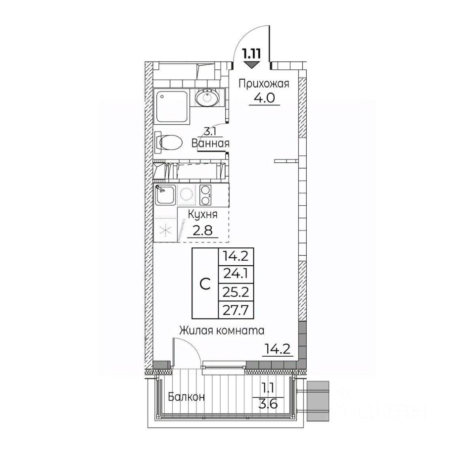 Общая площадь квартиры — 27.7 кв. м, этаж 12 из 22.