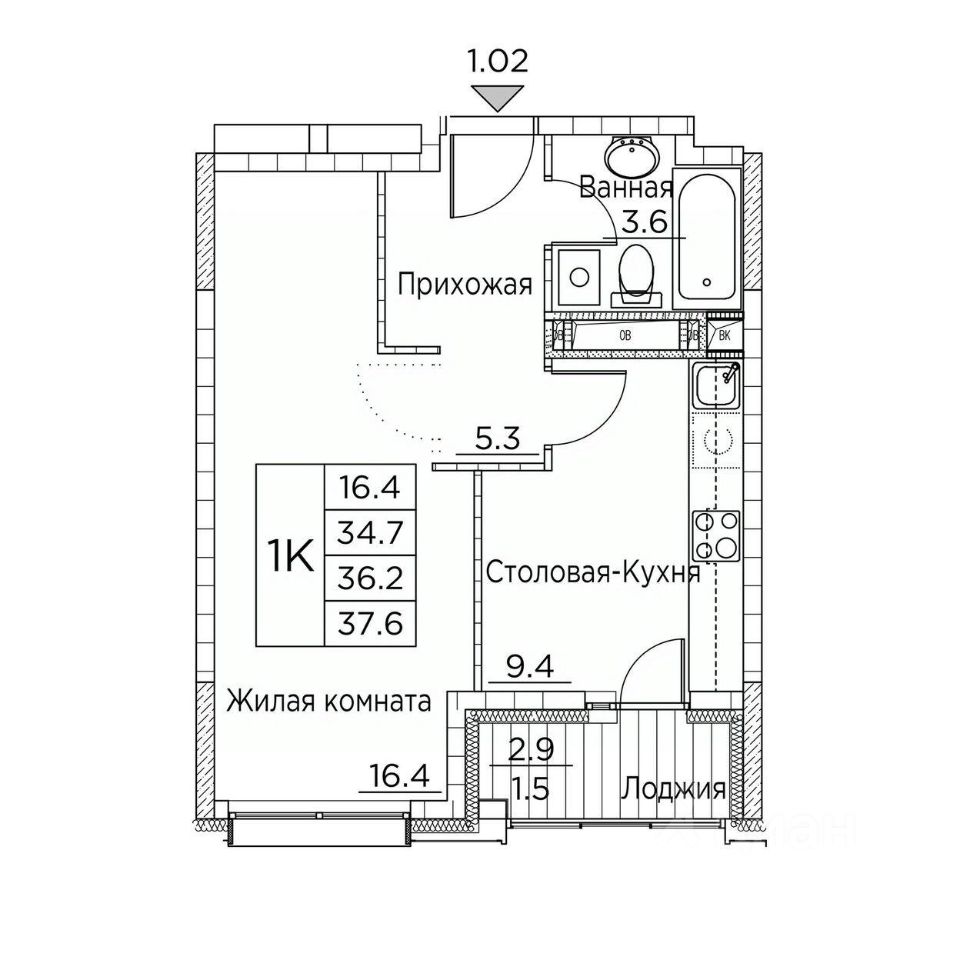 Общая площадь37,6 м²