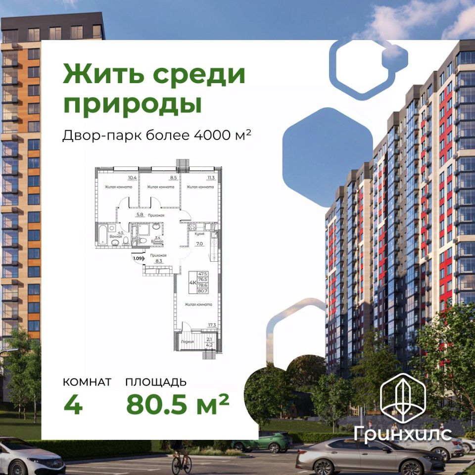 Продается 4-к квартира с отделкой под ключ в ЖК "Гринхилс".