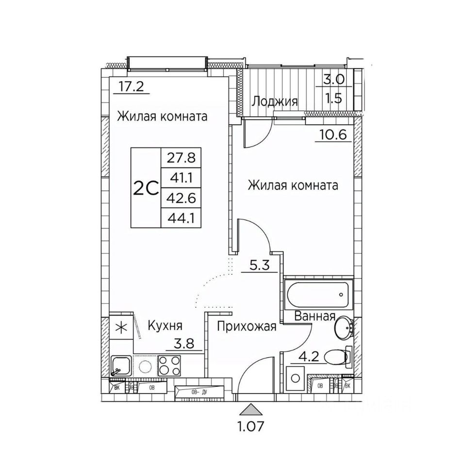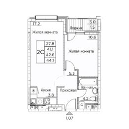 Общая площадь квартиры — 44.1 кв. м, этаж 17 из 22.