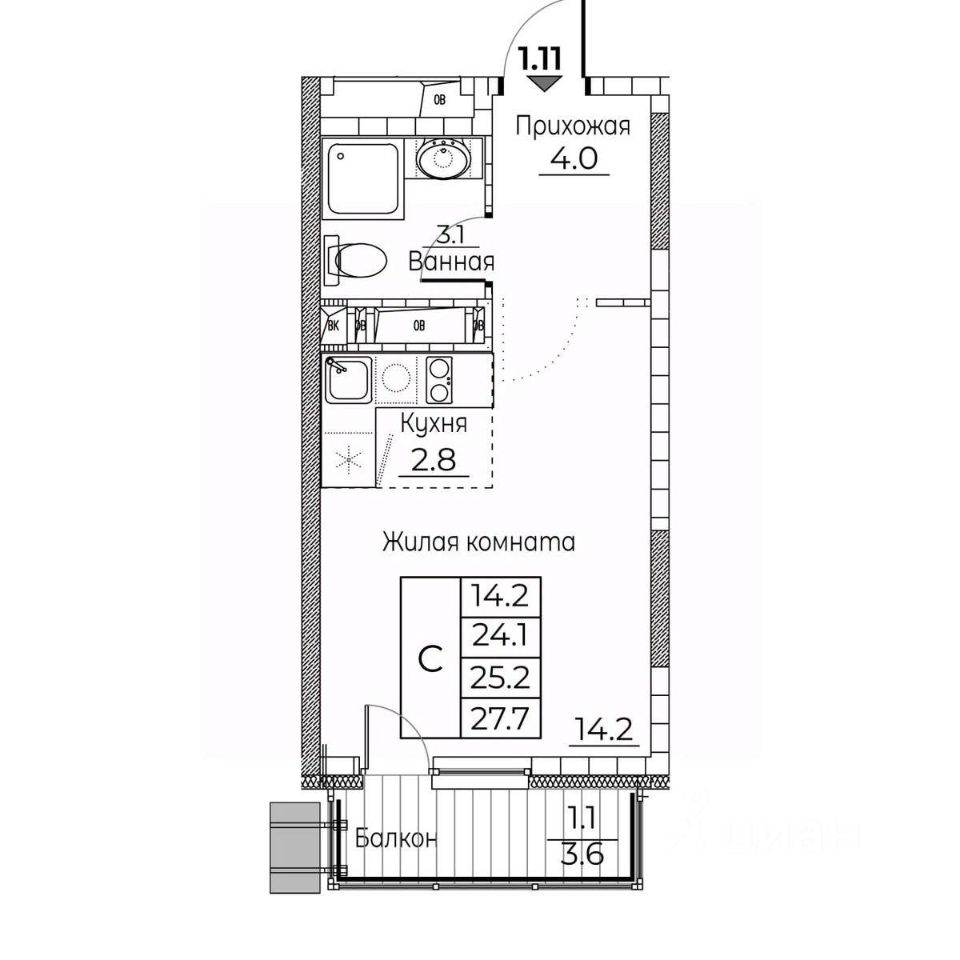 Общая площадь квартиры — 27.7 кв. м, этаж 17 из 22.