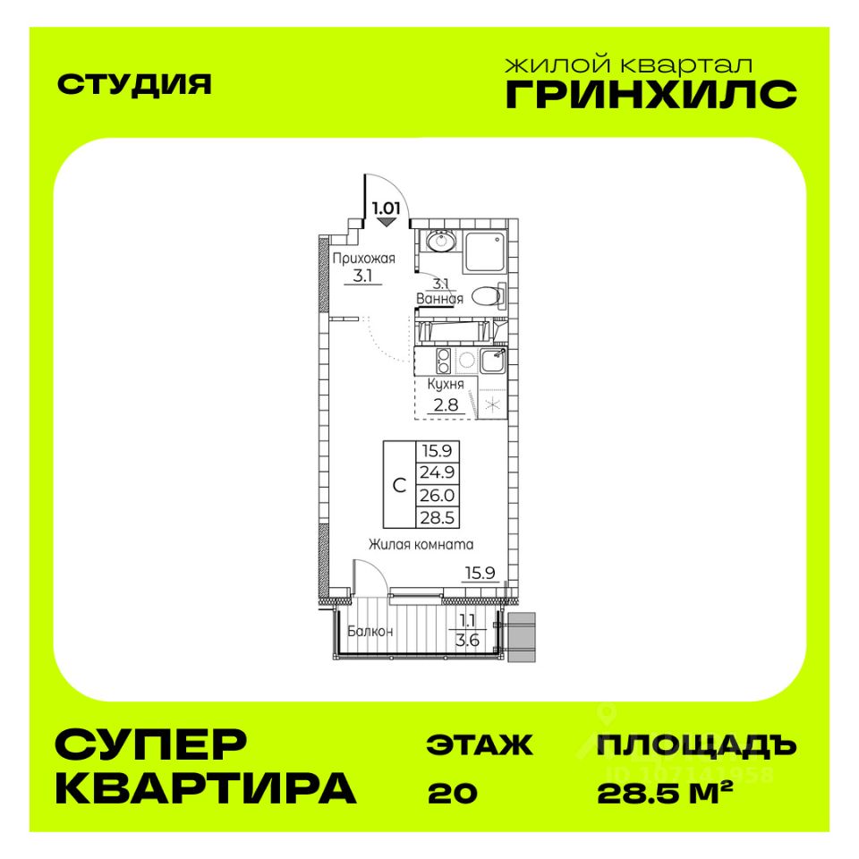 Общая площадь квартиры — 28.5 кв. м, этаж 20 из 22.