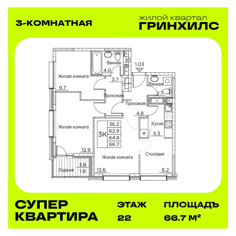 Общая площадь квартиры — 66.7 кв. м, этаж 22 из 22.