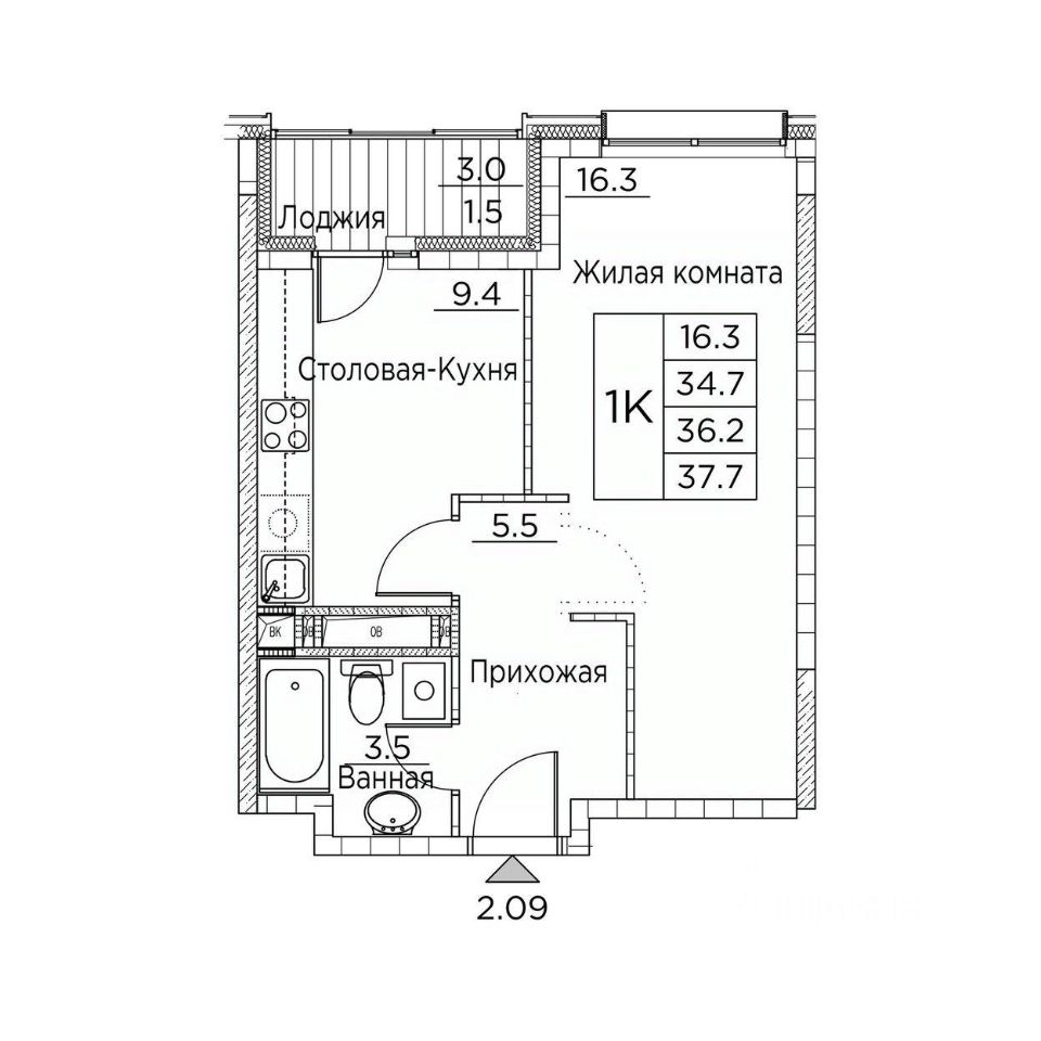 Общая площадь37,7 м²