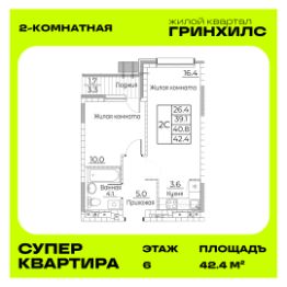 Общая площадь квартиры — 42.4 кв. м, этаж 6 из 23.