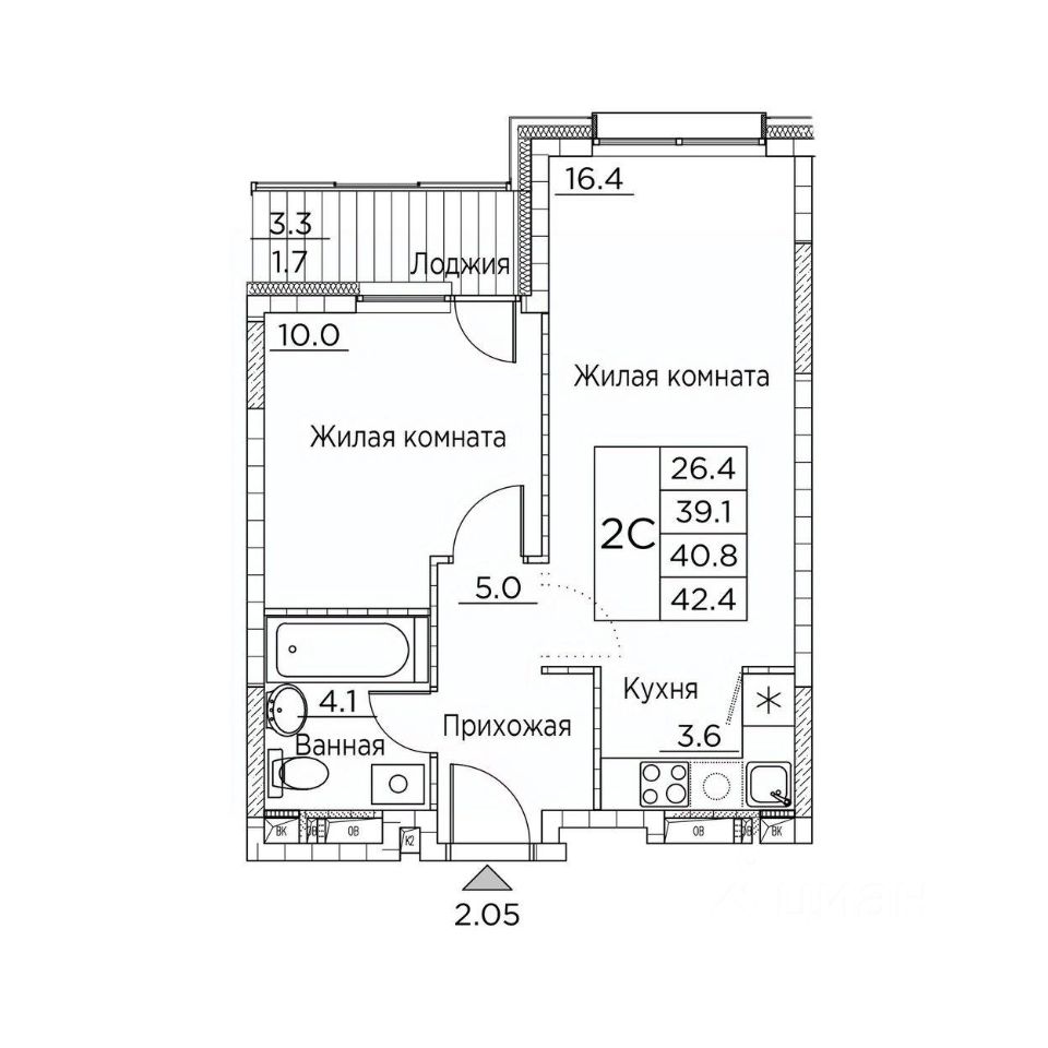Общая площадь42,4 м²
