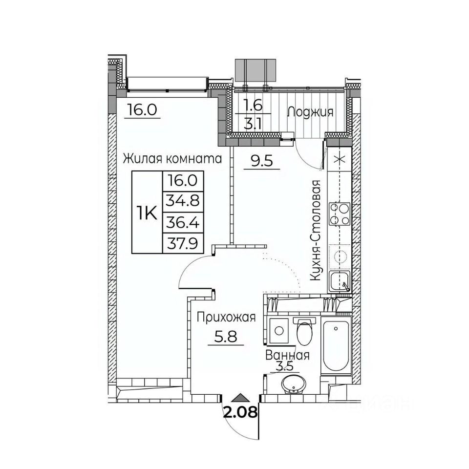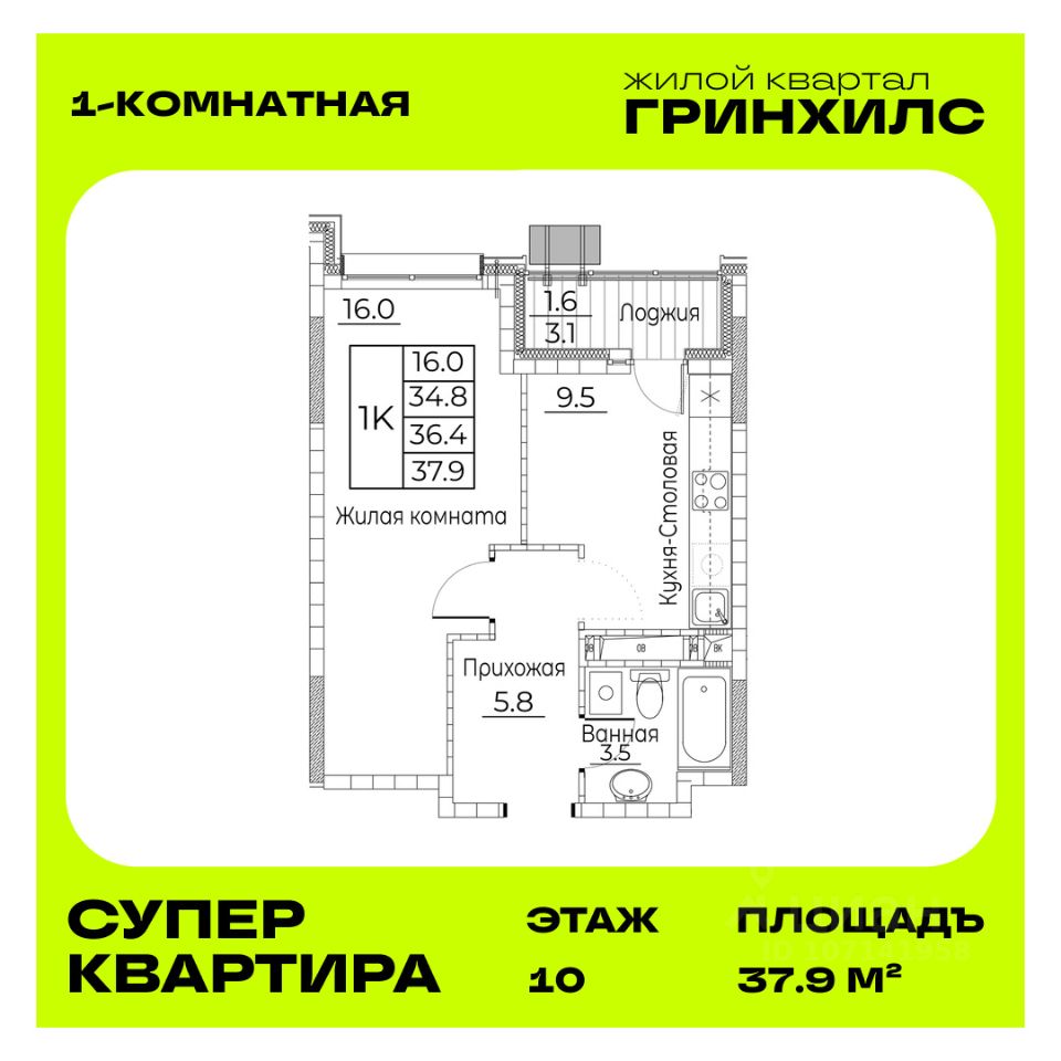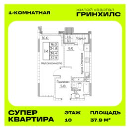 Общая площадь квартиры — 37.9 кв. м, этаж 10 из 23.